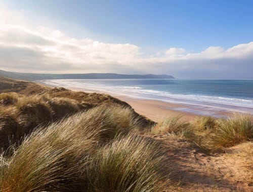 Woolacombe Beach is a popular destination in Devon, England, known for its golden sands, crystal-clear waters, and excellent surfing conditions. This beach has been awarded the Blue Flag for cleanliness and safety, making it an ideal spot for families and water sports enthusiasts alike. Woolacombe Beach also offers stunning views of the surrounding coastlines and cliffs.