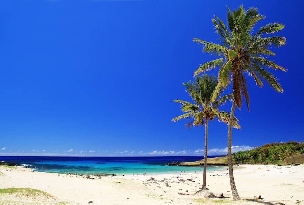 Anekena Beach on Easter Island is a beautiful beach is located on the northern side of the island and is one of the few sandy beaches in the region. With its stunning turquoise waters, white sand, and swaying palm trees, Anakena Beach offers a perfect setting for relaxation and adventure. The water temperatures are warm enough for swimming at anytime of year.
