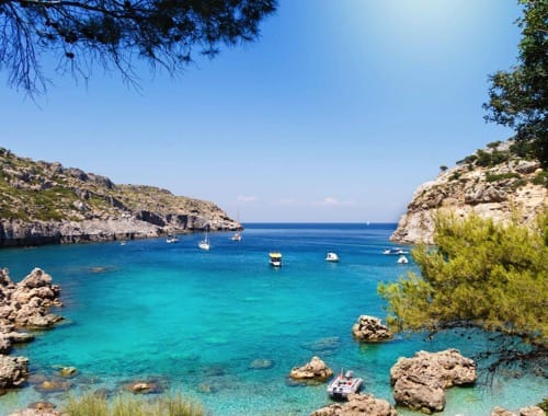 Located near Lindos on Rhodes Island, St Paul's Bay is a beautiful cove with turquoise water and a sandy beach. This bay is surrounded by rocky cliffs, offering a picturesque and tranquil setting for visitors. The calm waters make it an excellent spot for snorkeling and exploring the underwater world. Visit St Paul's Bay between June and September for the warmest weather and ideal beach conditions.