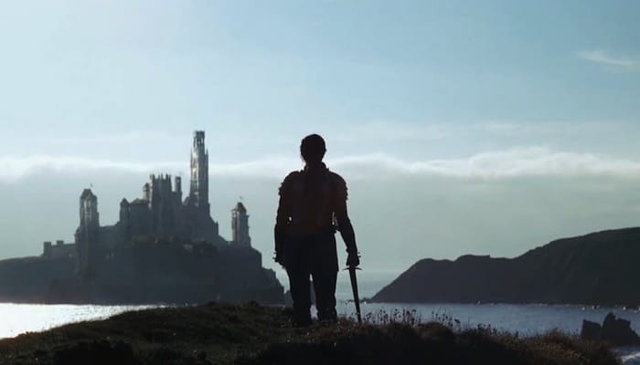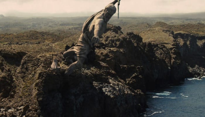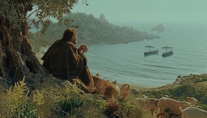 Odysseus (Sean Bean) looks down on a bay in Ithaca, Greece, the actual filming location was at Ghajn Tuffieha Bay in Malta.