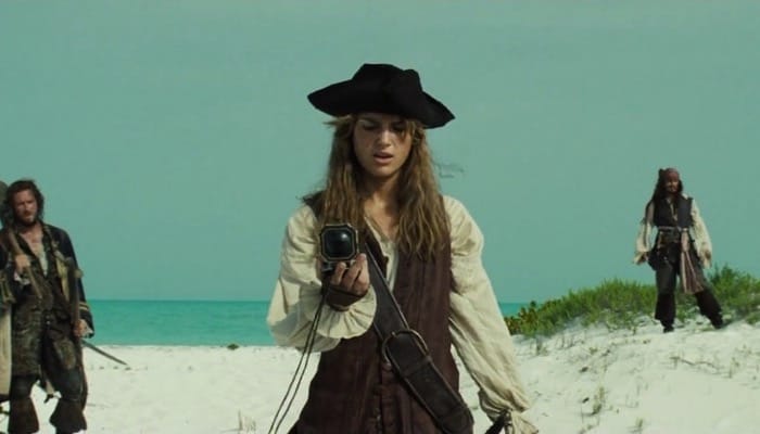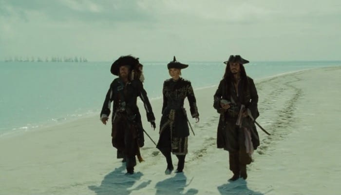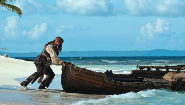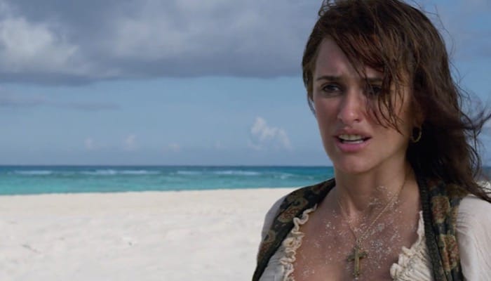 Jack Sparrow (Johnny Depp) maroons Angelica (Penelope Cruz) on Sola Fide Beach at the end of the movie.