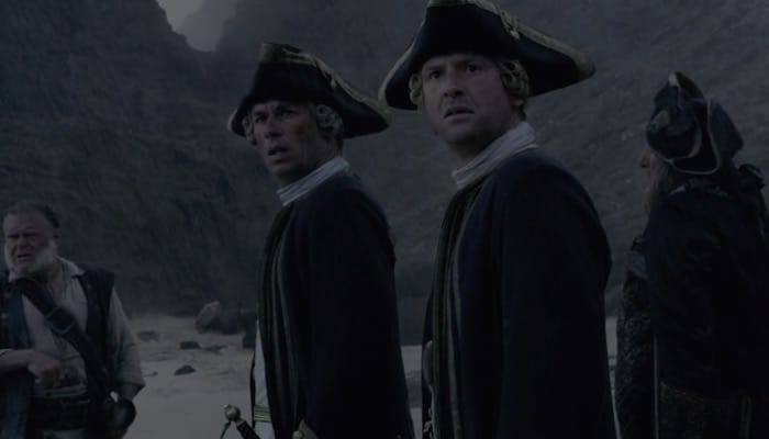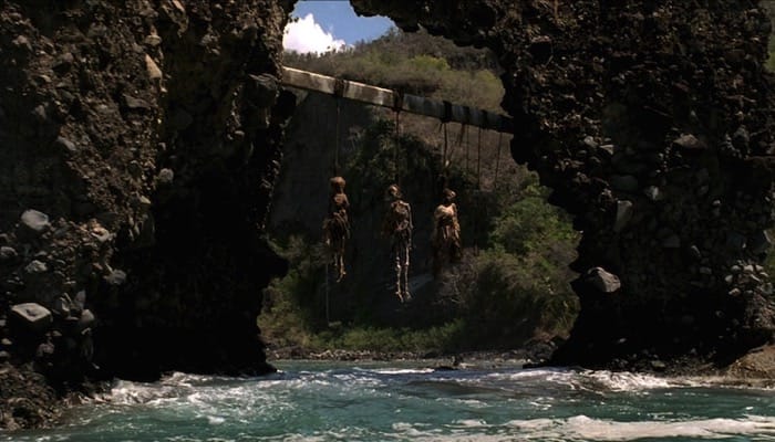 As Jack Sparrow (Johnny Depp) first enters Port Royal he passes three pirate corpses hanging on the inside of a rocky arch, which is at the entrance to Wallilabou Bay.