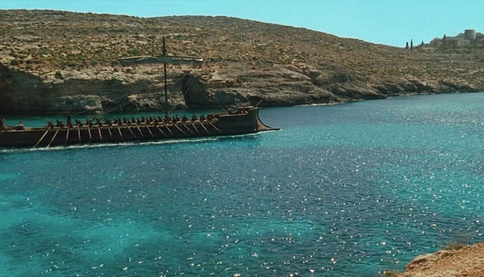 The famous Blue Lagoon on Comino island of Malta was the setting for a galleon rowed passed Achilles (Brad Pitt).